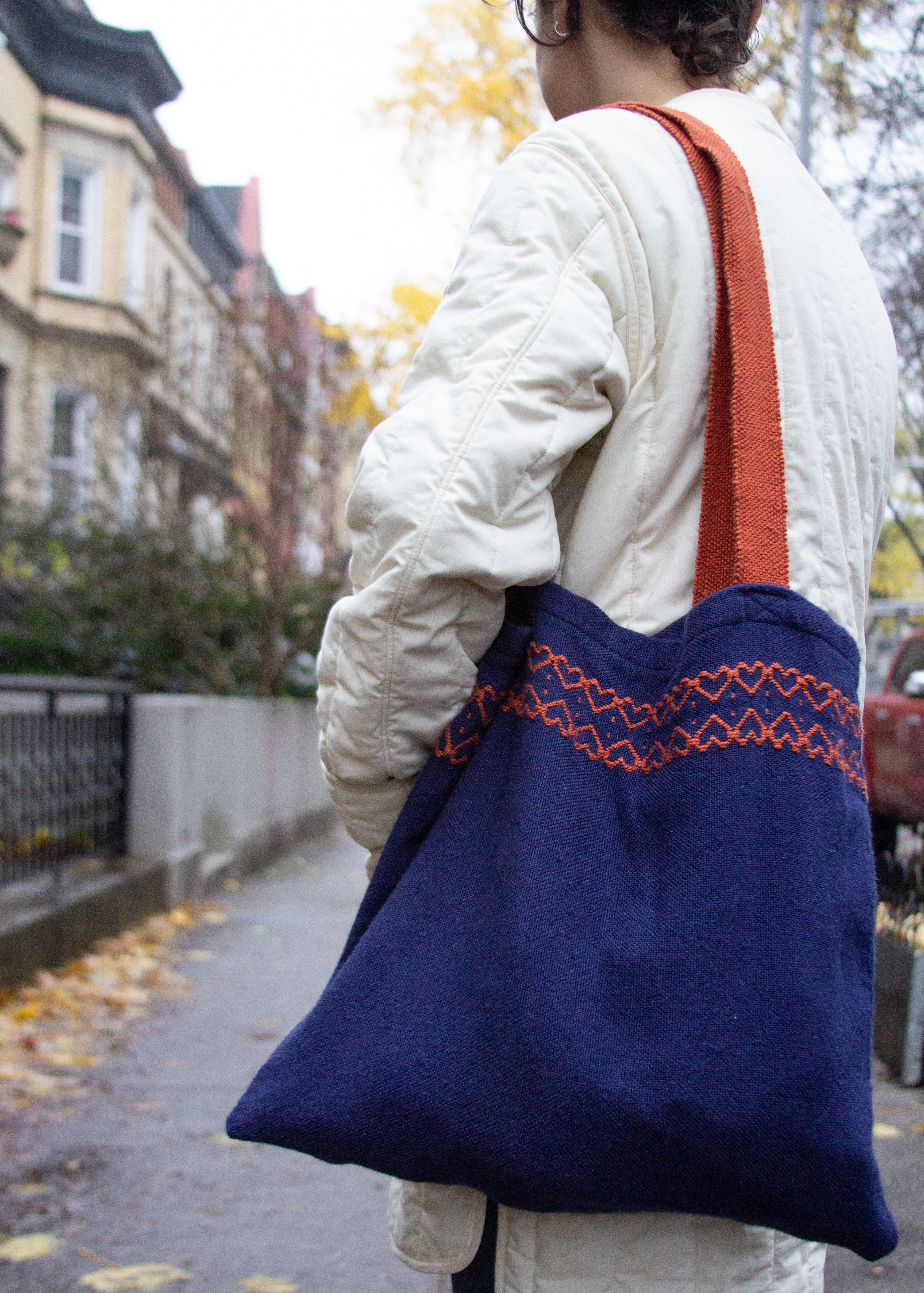 16 x 14.5 inches. navy + burnt orange. cotton. 2022.